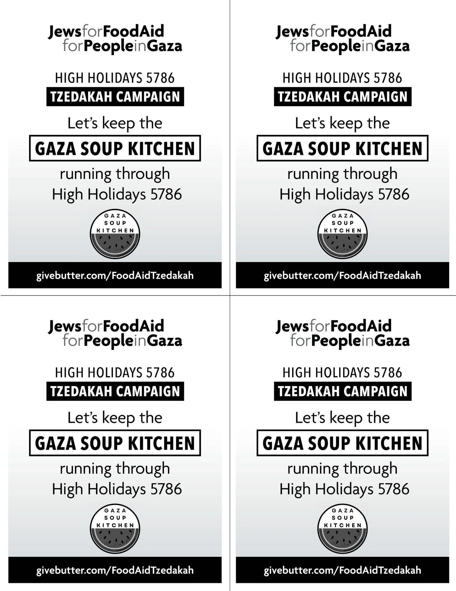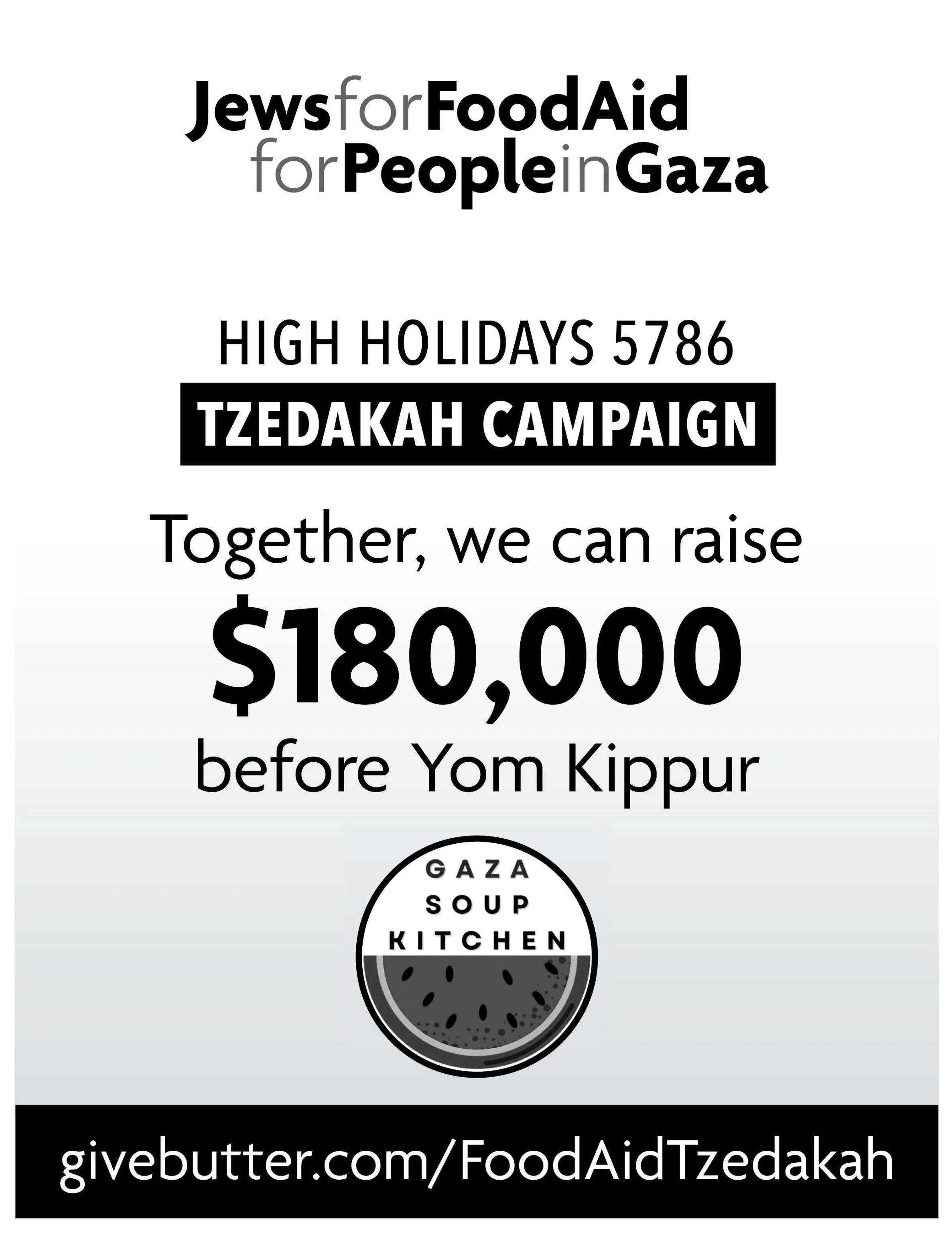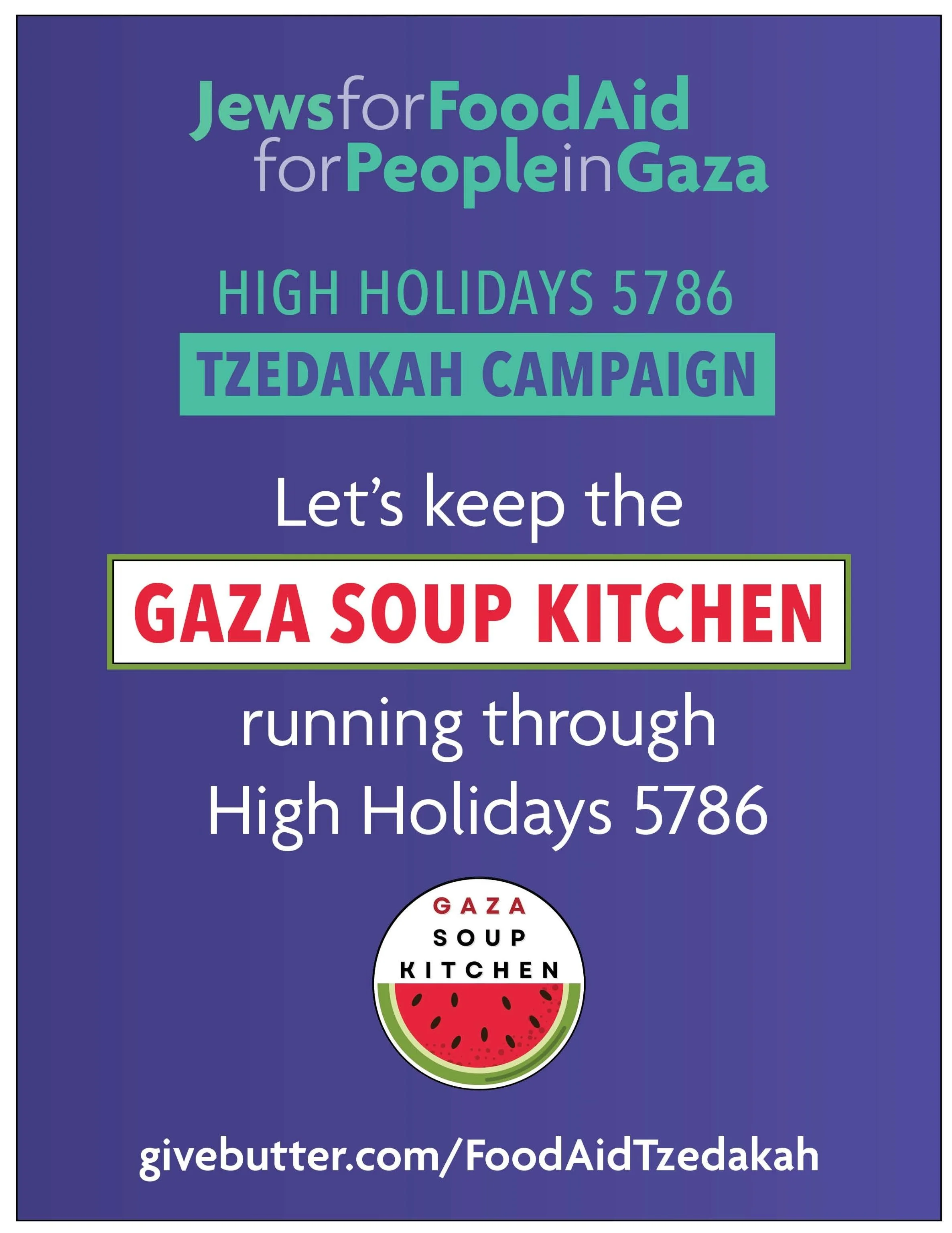 Our Congregation is proud to be part of the Jews for Food Aid for People in Gaza campaign. As part of that, we are participating in the High Holidays Tzedakah Campaign that is aiming to raise $180,000 for the Gaza Soup Kitchen.
